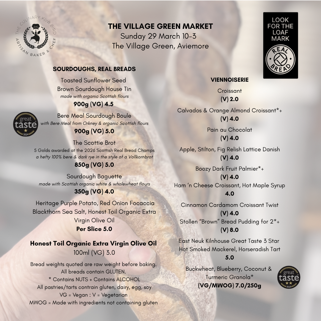 My sourdoughs are made with predominantly organic Scottish flours from Mungoswells North Berwick and Beremeal from Orkney - these flours are from small mills and are free from fortificants; my pastries are made with the best French pastry flour from Foricher Moulins and organic pastry flour from Shipton Mill, with butter from The Edinburgh Butter Company. My salt comes from Great Taste Award winning 3 Star Blackthorn Salt over in Ayrshire. Everything is handcrafted by me in my home based micro-bakery. As for other ingredients, I try to keep it as local and as seasonal as possible.